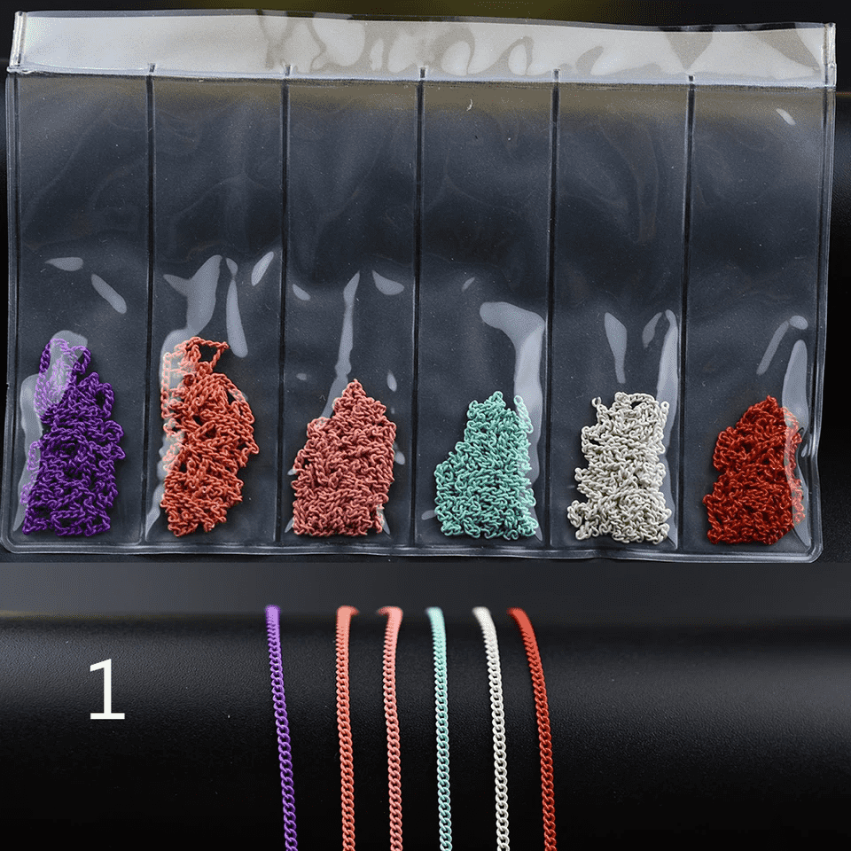 This pack of six brings a fusion of styles, featuring gold, silver, and rose metal chains along with elegant pearls.and neon colors Perfect for creating 3D nail art designs, these decorations add a touch of punk-inspired flair to your manicures. Crafted with precision and versatility, this mixed chain set is a new arrival that's sure to elevate your nail art. Unleash your creativity and adorn your nails with NailMePeriod's Metal Pearl Chain Nail Art Decorations – because every nail deserves a touch of punk sophistication!